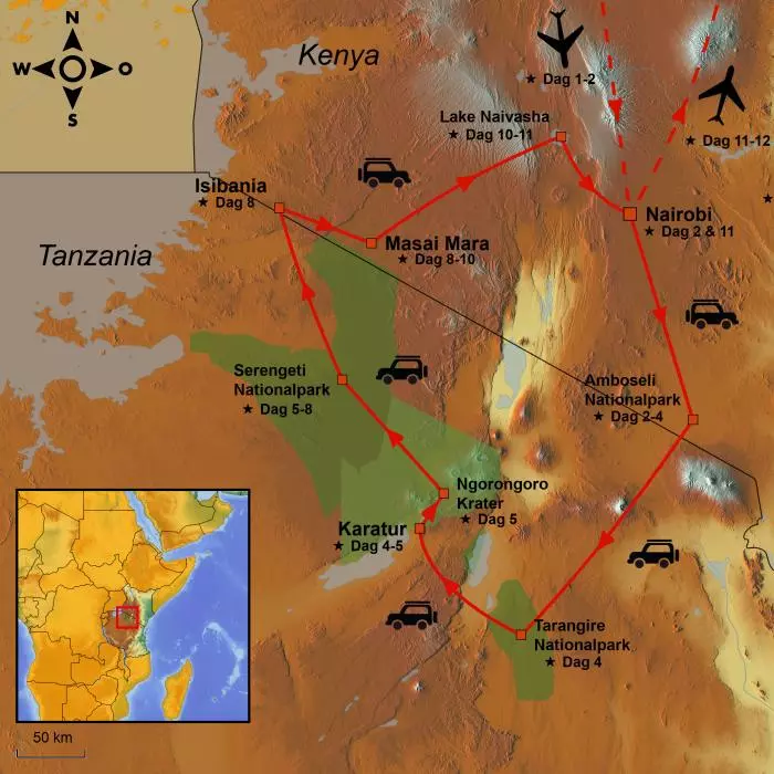 Rejsen tager sin begyndelse i Amboseli Nationalpark i Kenya. Du kender sikkert parken fra fotos; her er elefanterne ofte afbilledet med Kilimanjaro i baggrunden. Således introduceret til Tanzania rejser du over grænsen og besøger Tarangire Nationalpark i Tanzania. Parken er især kendt for elefanter og for sine kæmpemæssige baobab-træer. I Ngorongoro-krateret venter en ”Jurassic Park”-oplevelse, inden landskabet skifter dramatisk, og du begiver dig ud på de mægtige sletter ved Serengeti. Her slutter de fleste safarier – men ikke din; du krydser endnu engang grænsen og retur i Kenya venter nu Masai Mara. Sidste stop på rejsen er Lake Naivasha, inden du bliver kørt retur til lufthavnen i Nairobi. Herfra er der mulighed for badeferieforlængelse til Mombasa, Zanzibar eller Mauritius.