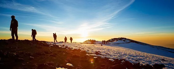 Omkring midnat står du op og du får serveret en snack, inden du i mørke starter den sidste opstigning til toppen. Det vanskelige terræn de ca. 6 timer frem til Stella Point er den største udfordring for de fleste. Målet er at nå Stella Point kort tid efter solopgang, så du kan nyde den rødglødende solopgang her. Hvilet bliver ikke langt, da det ellers bliver nærmest uoverkommeligt at komme i gang igen som følge af kulde og træthed. Du fortsætter langs kraterkanten og det sidste stykke er en jævn stigning. Afhængig af årstiden kan du risikere, at der er sne det sidste stykke til dit endelige mål, som er Uhuru Peak, toppen af Kilimanjaro og toppen af Afrika. Når du toppen 5.895 m.o.h., kan du klappe dig selv på skulderen, nyde den fantastiske udsigt og tage et selfie ved Uhuru Peak skiltet, som evigt minde.