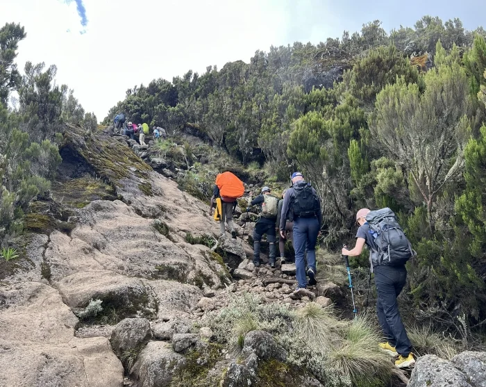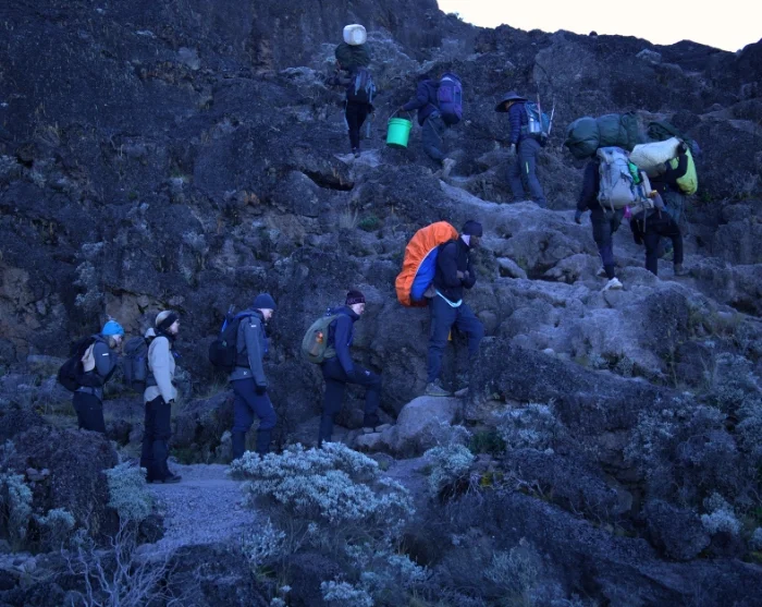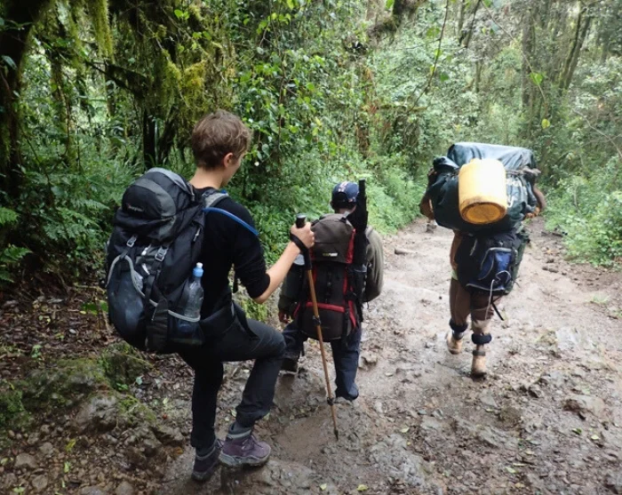 Herefter starter nedstigningen til Barafu Camp, det tager ca. 3 timer. Her får du et velfortjent, men kort hvil, inden du vandrer videre ned ad en stenet sti til Mweka Camp, hvor der venter dig en velfortjent nattesøvn. Lejren ligger i den øverste del af skoven, hvor der ofte er tåge og regn sidst på eftermiddagen. Højdepunktet er, at der her venter varmt vand og varm mad.