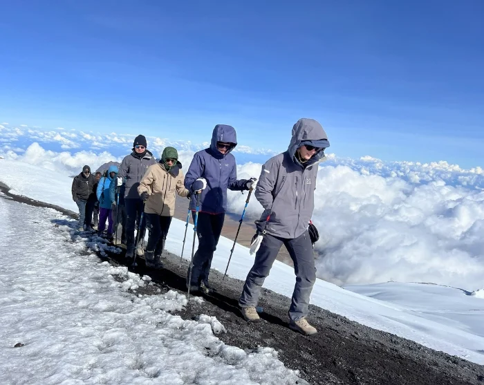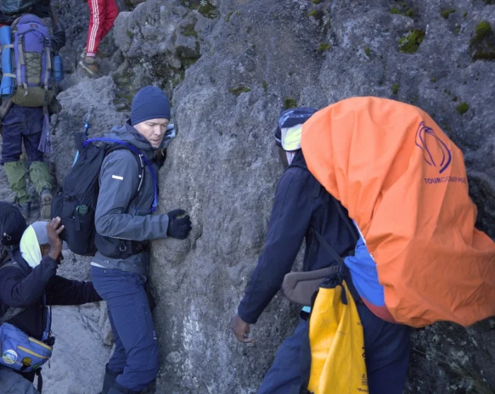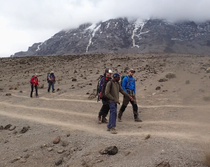 Efter en nat under den imponerende Great Barranco Wall og et solidt morgenmåltid klatrer du op ad den berygtede klippevæg. Noget som heldigvis er lettere end det ser ud til. På toppen under Heim gletsjeren, der hænger som kæmpe is-gardiner ud over massivet, folder Kilimanjaros skønhed sig ud på fantastisk vis.