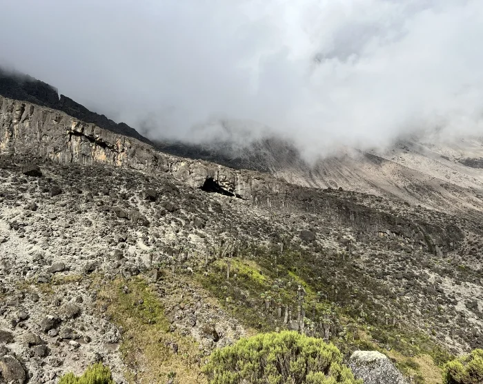 Du vandrer det sidste stykke gennem regnskoven, og snart åbner hedelandskabet sig og stierne bliver mere stenede. Du vandrer over Shira plateauet med udsigt til Kilimanjaro Western Breach, som er den vestlige kraterkant med den fantastiske gletsjer. Du er nu vest for den udslukte vulkan Kibo på den modsatte side af Marangu ruten og efter et kort hike mod vest ankommer du til Shira 2 Camp.