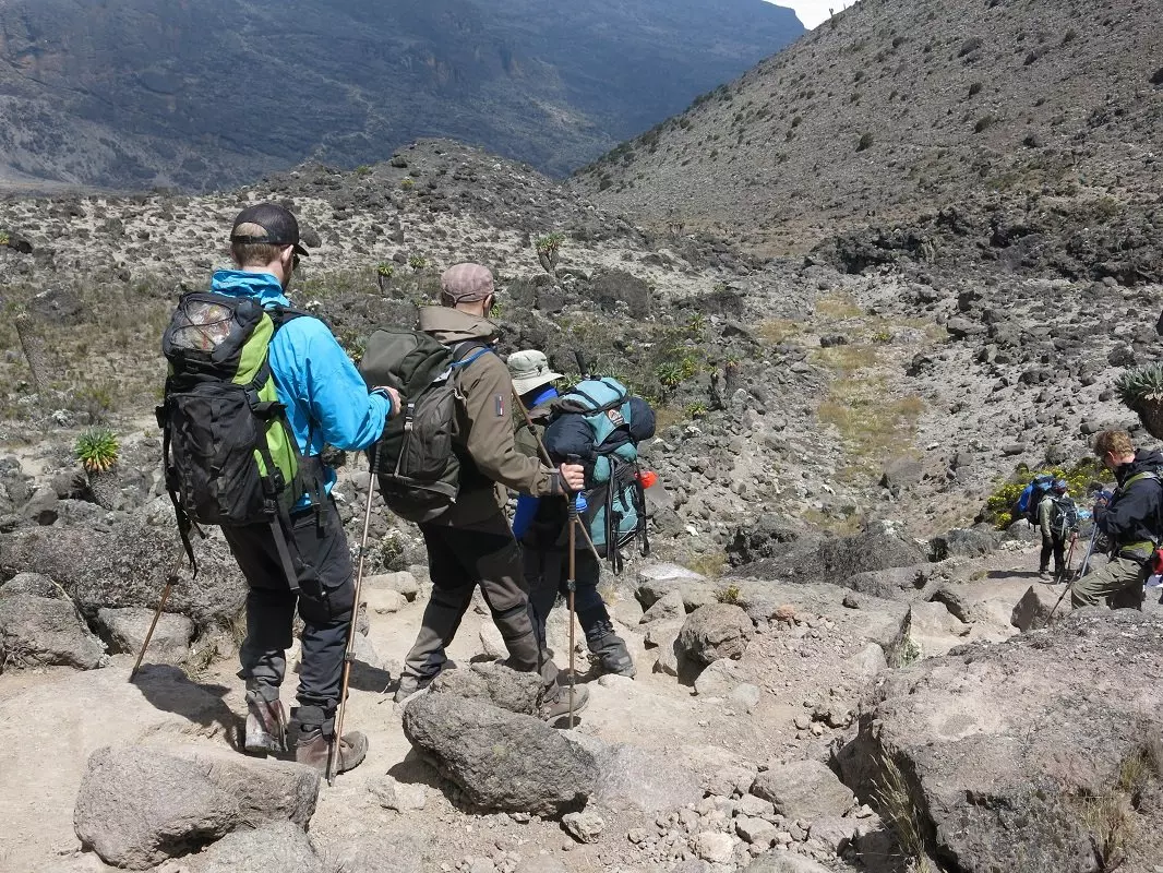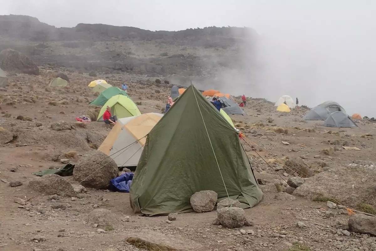 Herefter starter nedstigningen til Barafu Camp, det tager ca. 3 timer. Her får du et velfortjent, men kort hvil, inden du vandrer videre ned ad en stenet sti til Mweka Camp, hvor der venter dig en velfortjent nattesøvn. Lejren ligger i den øverste del af skoven, hvor der ofte er tåge og regn sidst på eftermiddagen. Højdepunktet er, at der her venter varmt vand og varm mad.