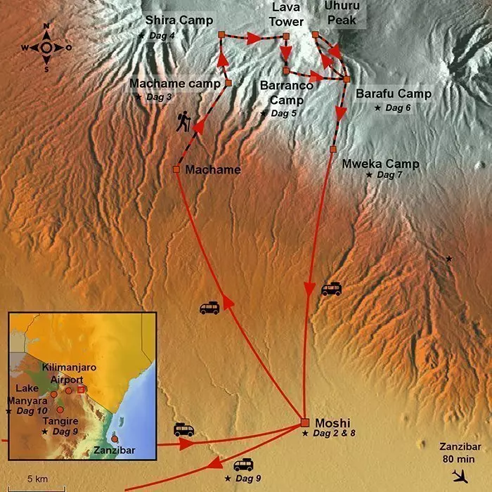 Efter morgenmaden forlader du Moshi og kører til landbyen Machame – en køretur på 50 min. Her møder du dit team af guider, kokke og bærere, som forbereder og pakker dit udstyr. Herefter går turen til Machame Gate, som er den sydvestlige indgang til Kilimanjaro Nationalpark. Her er der indtjekning og registrering, inden du begynder din vandring gennem regnskoven til toppen af Kilimanjaro. Kilimanjaro består af tre udslukte vulkaner; Kibo med det højeste punkt Uhuru (5.895 m.o.h.), Mawenzi (5.149 m.o.h.) og Shira (3.962 m.o.h.).
