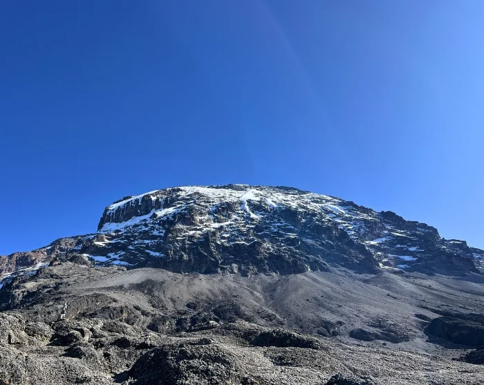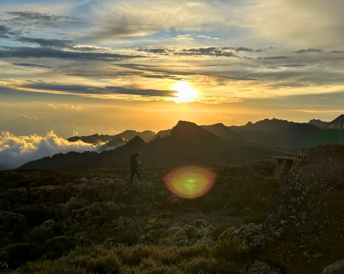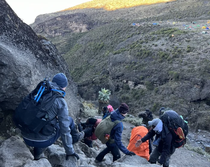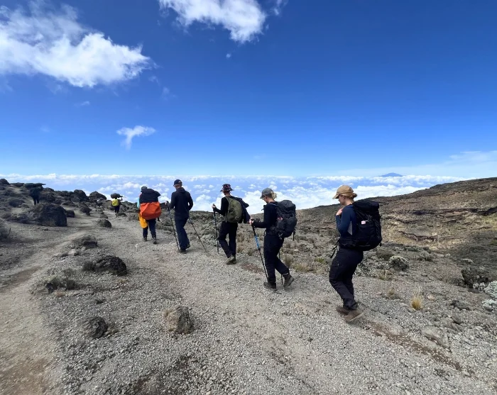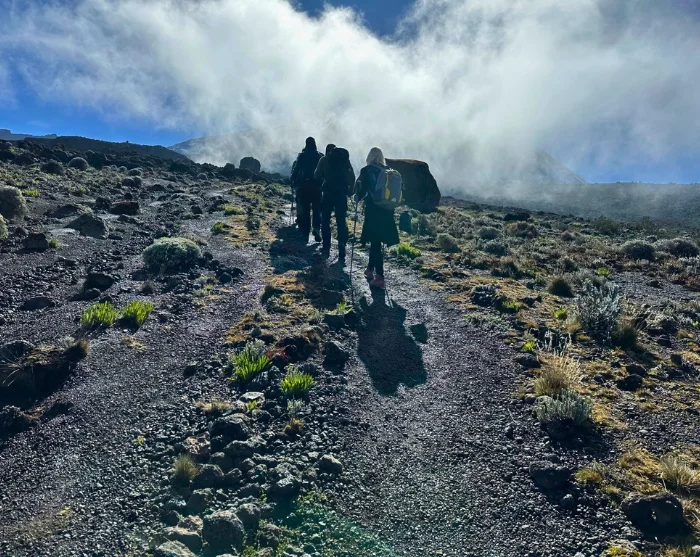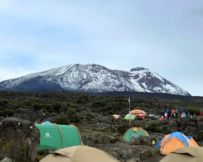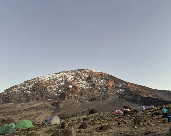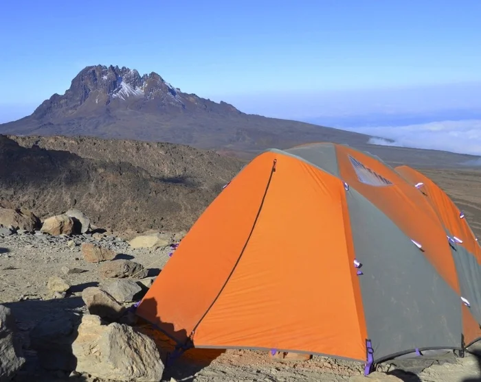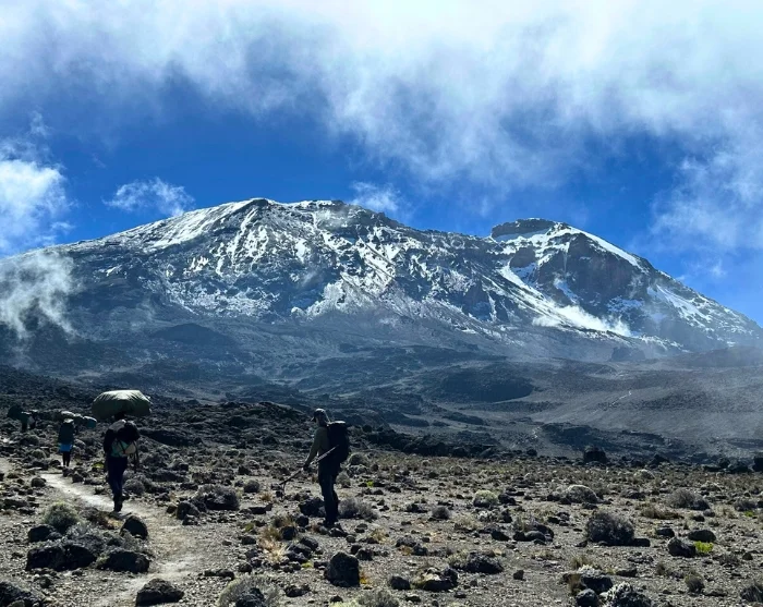 Herefter starter nedstigningen til Barafu Camp. Her får du et kort og velfortjent hvil, inden du vandrer videre ned ad den stenede sti til Mweka Camp, hvor der venter dig en velfortjent nattesøvn.