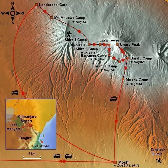 Højder: Moshi: 915 m.o.h., Londorossi Gate: 2.250 m.o.h., Lemosho Glades: 2.000 m.o.h., Mti Mkubwa Camp: 2.750 m.o.h.