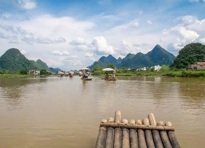 Tag på en stille og rolig rafting tur på Yulong-floden, som er den længste biflod til Li-floden, der løber fra Guilin til Yangshuo.