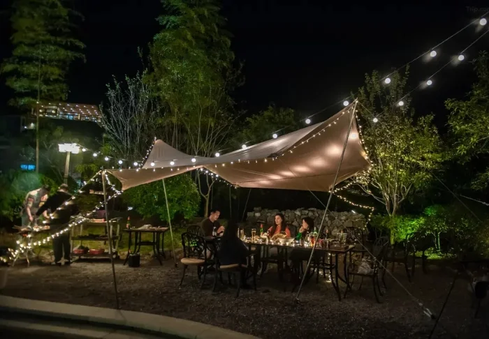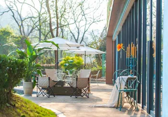 Udendørsområdet er en vigtig del af opholdet. Haven er anlagt med stier, grønne beplantninger og små opholdszoner. Om dagen er her plads til pauser mellem oplevelserne, mens aftenerne ofte samler gæsterne under lyskæder i en afslappet stemning, hvor tempoet sættes ned.