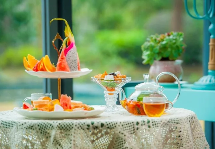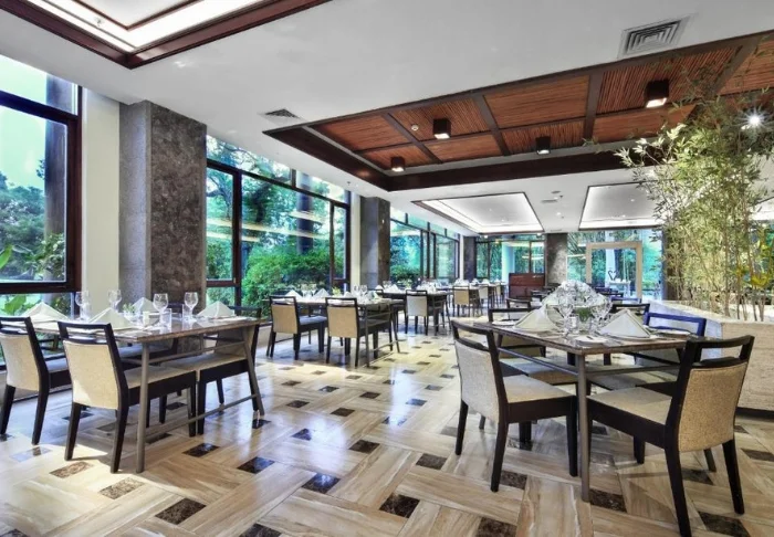 Resortets restaurant serverer både kinesiske retter og enkle internationale klassikere. Du kan vælge mellem indendørs og udendørs siddepladser, og mange vælger at sidde udenfor for at nyde udsigten til haven og de omkringliggende bjerge.