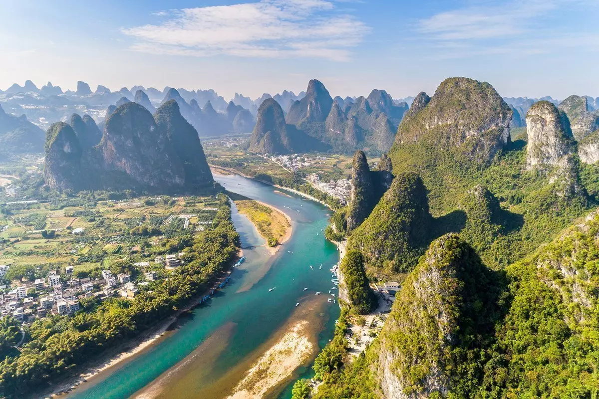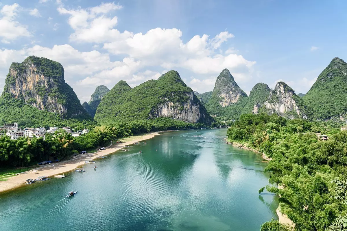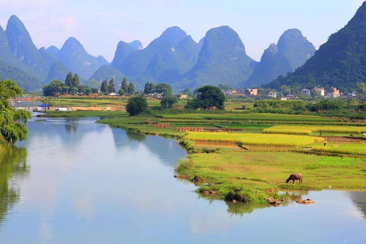Jo længere mod syd og vest du kommer, jo friskere bliver luften. Det kan især mærkes i Yangshuo, hvor du fortrylles af de poetiske og betagende landskaber. Her står høje, asymmetriske kalkstensbjerge, der spejles ned i de rolige floder, Li og Yalong. Så enestående et landskab, at det er foreviget på 20-yuan pengesedlen.