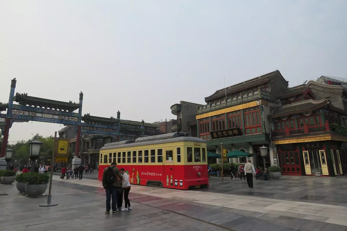Du går fra hotellet til den 840 meter lange shoppinggade Dashilan, der ligger syd for Den Himmelske Freds Plads. Dashilan blev grundlagt under Ming-dynastiet for over 600 år siden, men begyndte for alvor først at blomstre under Qing-dynastiet. Lige inden OL i 2008 gennemgik gaden en omfattende renovering, hvor man besluttede at holde fast i den traditionelle stil fra Ming- og Qing-dynastierne. I den nordlige ende af gaden står et af Dashilans kendetegn, den røde og gule sporvogn fra gammel tid. Du fortsætter herfra til Beijings berømte samlingspunkt, Den Himmelske Freds Plads.