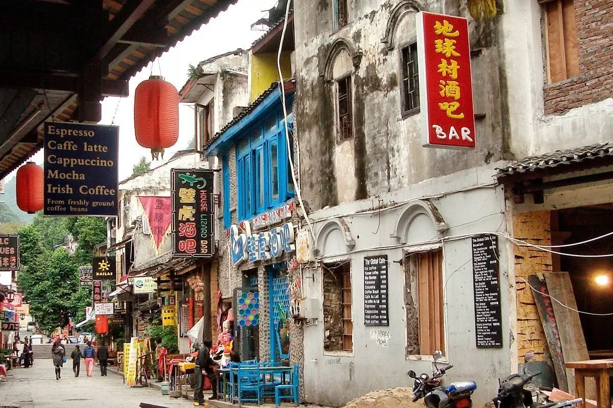 Inde i centrum af byen er der masser af liv. Her ligger barer og restauranter så stribe, og især gaden West Street er et populært samlingspunkt. West Street er den ældste gade i Yangshuo med en historie der går mere end 1.400 år tilbage, hvilket også afspejles i de gamle, charmerende huse. Det er desuden stedet, hvor Østen møder Vesten: Gaden er fyldt med butikker, caféer og spisesteder, der både serverer vestlige og kinesiske specialiteter.