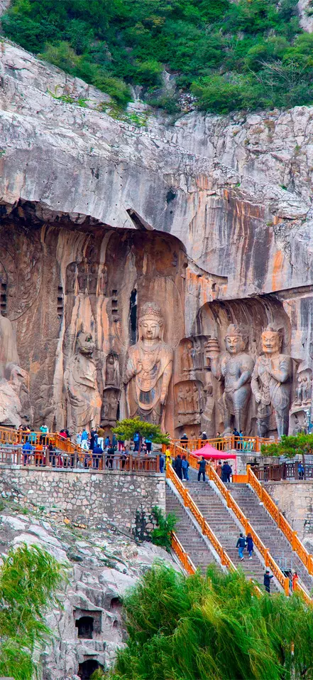 Du besøger de vigtigste grotter, herunder Forfædre-grotten, som er udhugget i årene 672-675 under Tang-dynastiet. Forfædre-grotten er den største og langt den mest imponerende af dem alle. Det er her, du finder den 17 meter høje Buddha, som har 2 meter lange øreflipper. Normalt er buddhaer maskuline, men ansigtet på denne Vairocana-Buddha (Losana) er meget feminint, og det siges at være kejserinde Wu Zetian fra Tang-dynastiet. Buddhafiguren er omringet af de to disciple Ananda og Mahakasyapa samt to bodhisattvaer.