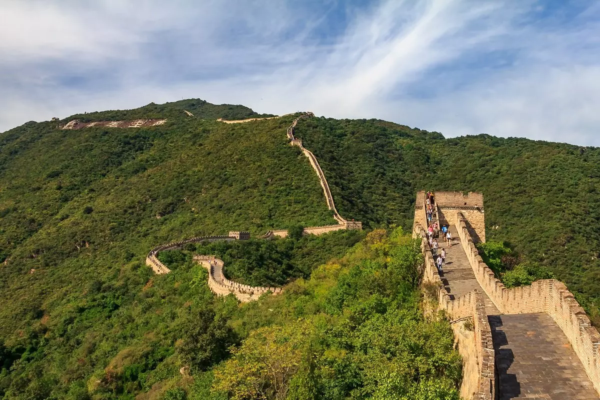 Muren er delt op i flere forskellige områder, og du besøger det mindre turistede område Mutianyu. Du og guiden bliver sat af på parkeringspladsen tæt ved Mutianyu, og herfra går du op ad en stejl vej til kabelbanen, der fører op til muren.