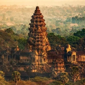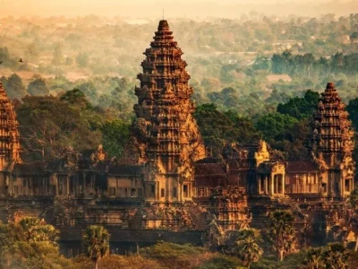 Tempelkomplekset Angkor Wat, som er Cambodias største attraktion. Templet var Khmer-rigets prægtigste tempel og et arkitektonisk mesterværk. Det siges at have taget ca. 300.000 mænd og 6.000 elefanter 37 år at opføre komplekset.