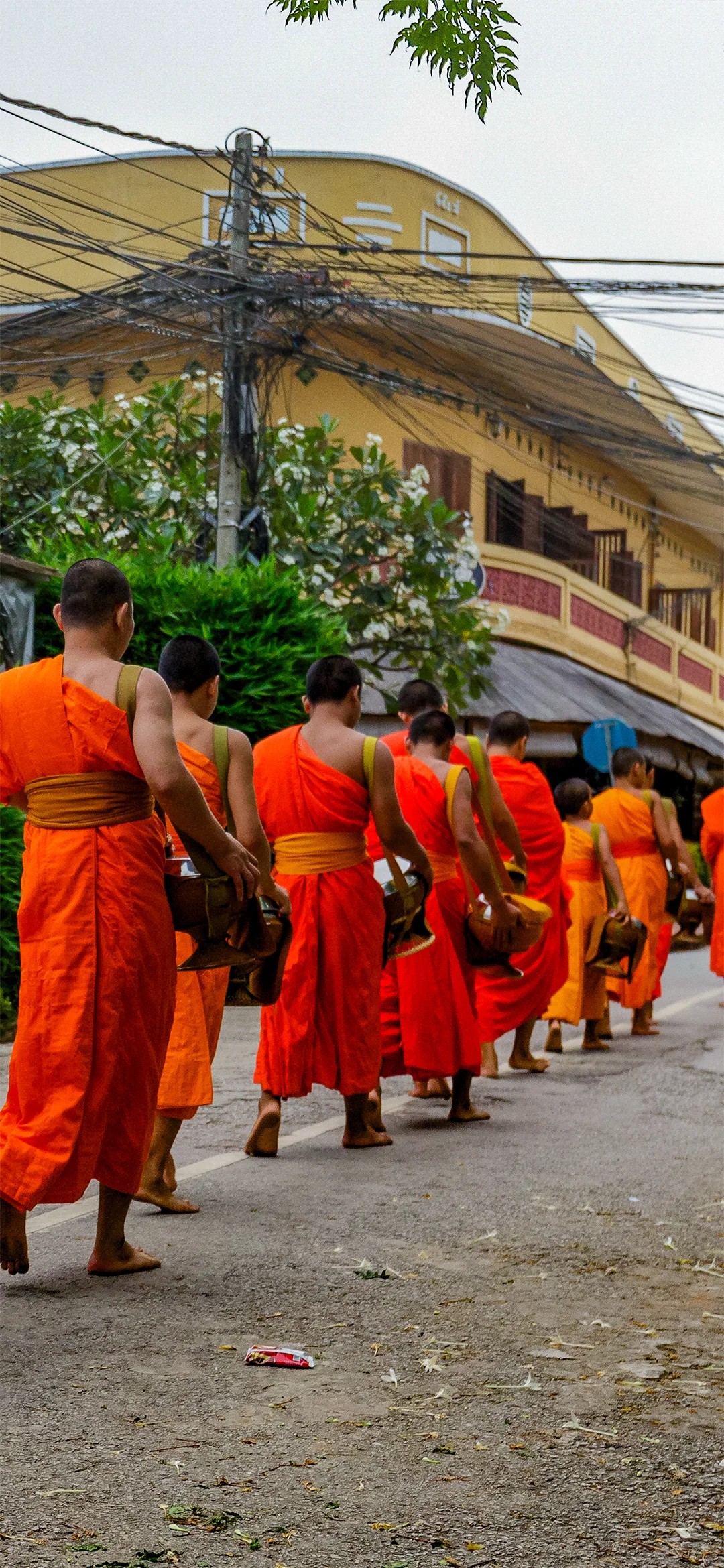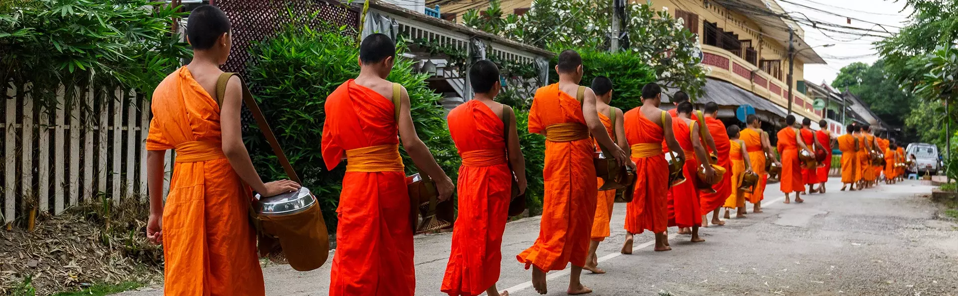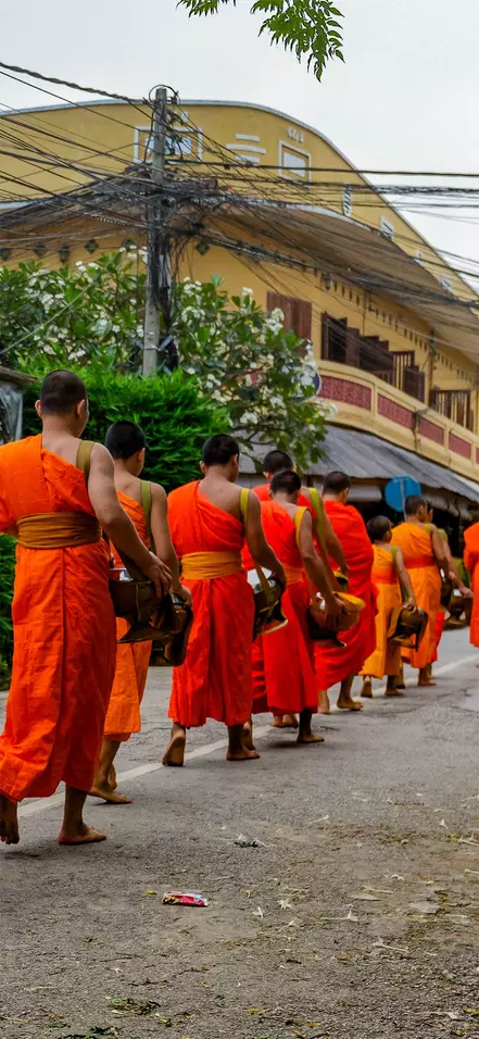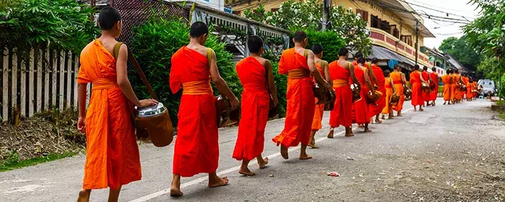 Hver morgen i de tidlige morgentimer udspiller der sig en helt særlig seance i Luang Prabang. Flere hundrede munke bevæger sig stille gennem gaderne for at samle almisser. Alle familier sender en repræsentant på gaden med mad eller drikkevarer, som bliver fordelt i munkenes skåle. Det er svært ikke at blive grebet af den respektfulde stilhed og store værdighed, som dette daglige ritual foregår med.