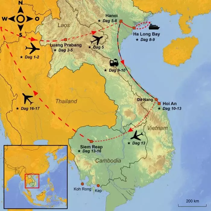 Rejsen starter i den gamle kongeby Luang Prabang i Laos. Byen er kendt for sin fredelige stemning, gyldne templer og den eventyrlige panoramaudsigt fra toppen af Phousi-bjerget. Du besøger også det kongelige palads og kan nyde en dukkert i det smukke Kuang Si-vandfald.