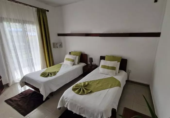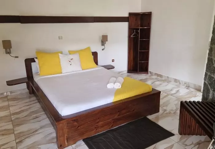 De 18 værelser på hotellet er relativt simpelt indrettet med rustikke møbler og god plads til bagagen. Alle har naturligvis eget badeværelse (omend af ældre dato), vifte og myggenet over sengene.