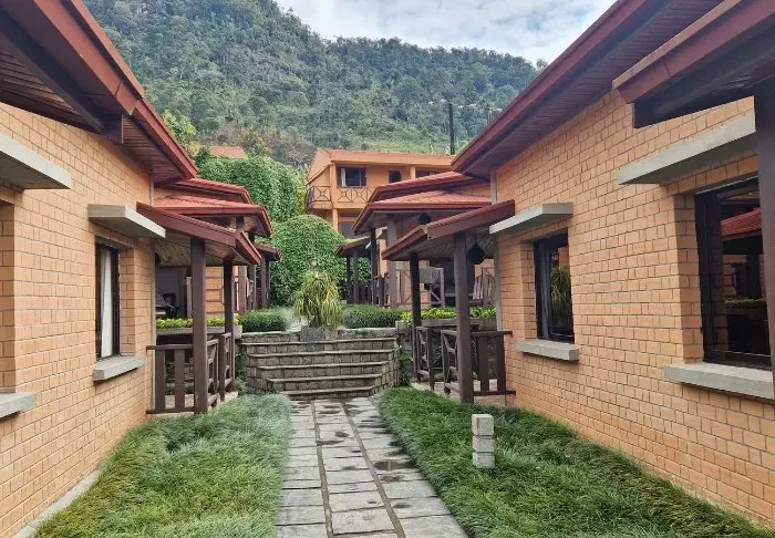 Hotellet ligger på en bakketop, og fra loungen og restauranten er den fin udsigt mod nationalparken. Værelserne ligger bag selve hovedbygningen, og man kommer hertil ad stier gennem den frodige have.