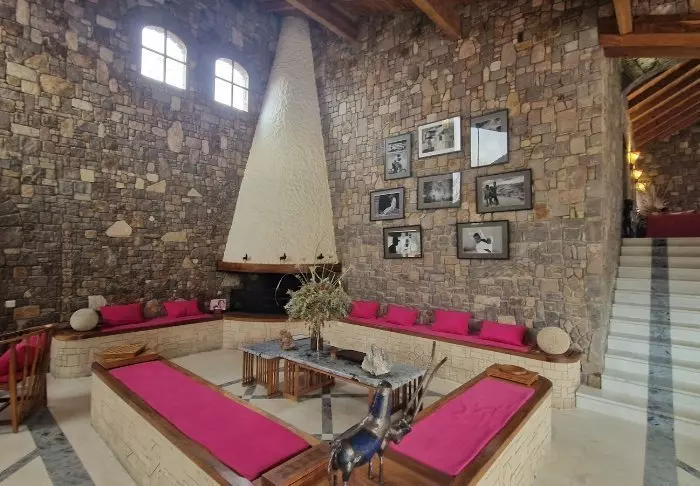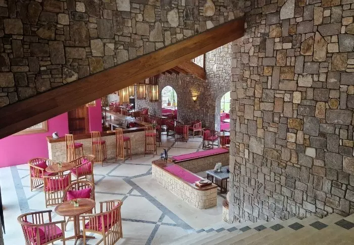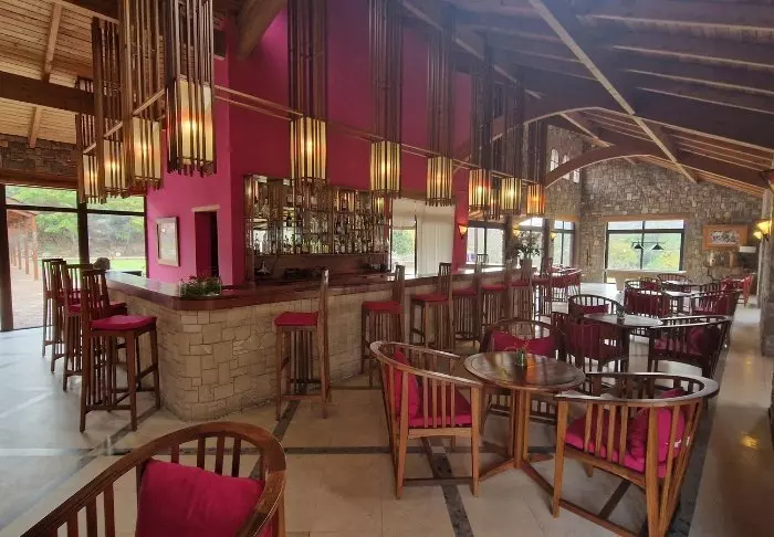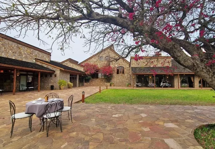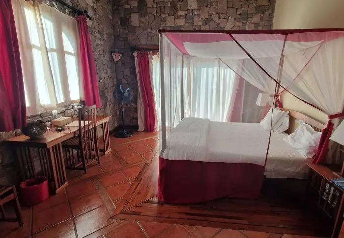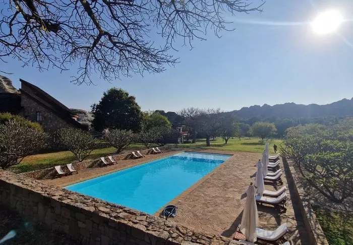Hotellet har 40 værelser, der er bygget i granitblokke, så de ligner det omkringliggende landskab mest muligt. Værelserne er bygget omkring den store centrale græsplæne, der i bunden ender i sandstensklipper, og her er altså på en gang både lys og luft og en følelse af at være tæt på naturen.