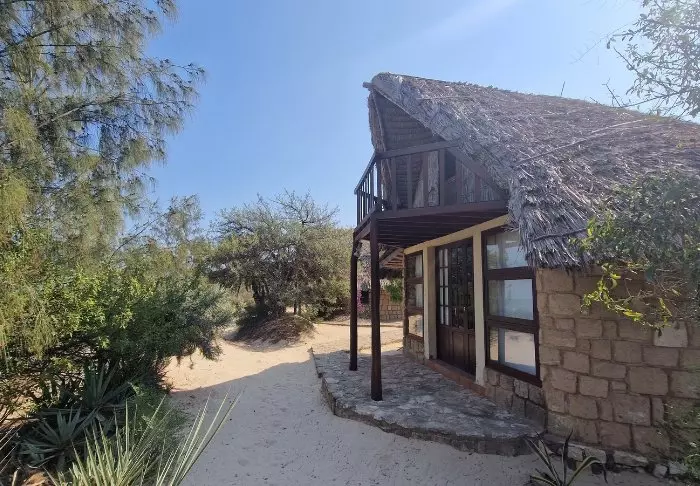Hytterne ligger spredt ud over et større område, som er forbundet af smalle stier og flankeret af tropiske planter. Her kan du nemt være heldig at se kamelæoner på vej til morgenmaden – og om aftenen måske endda en muselemur eller to.