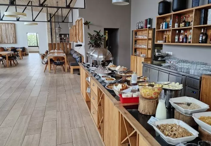 Måltiderne indtages i restauranten, som næsten leder tankerne hen på et fælleskøkken på en højskole – med langborde og et loungeområde, hvor man kan sidde og slappe af og få en drink inden middagen.
