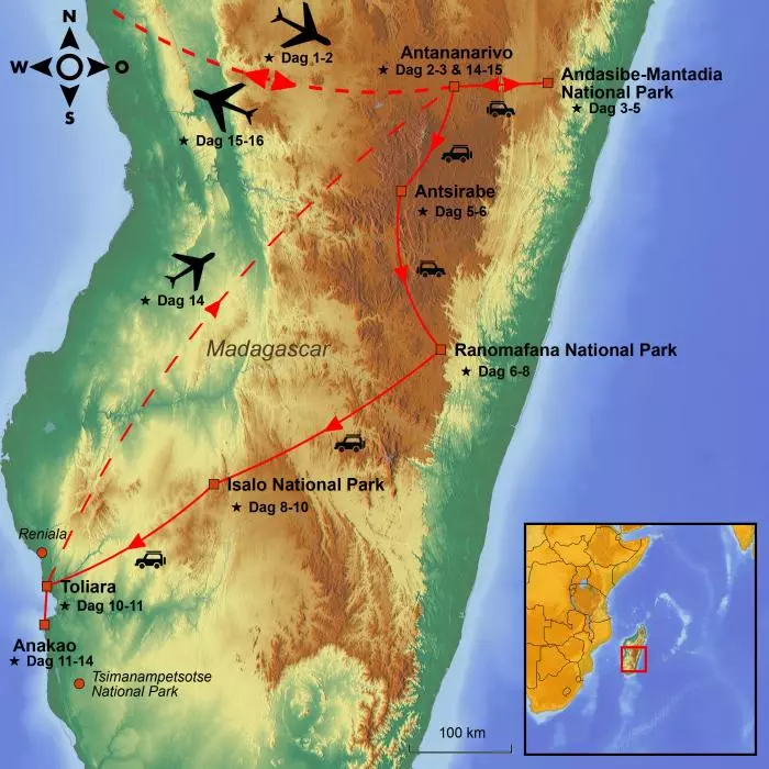 I dag er der afrejse fra valgte lufthavn. Rejsen går – med mellemlanding(er) undervejs – til Madagaskar, den store røde ø i Det Indiske Ocean.