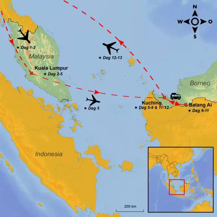 Efter et par dage i Kuala Lumpur kan du nu pakke rejsens første indtryk i bagagen og flyve videre til verdens tredje største ø, Borneo. Øen er hovedsageligt indonesisk mod syd, mens det lille land Brunei ligger mellem de to malaysiske stater, Sabah og Sarawak, der ligger mod nord, og som byder på en overflod af spektakulære natur- og dyreoplevelser.