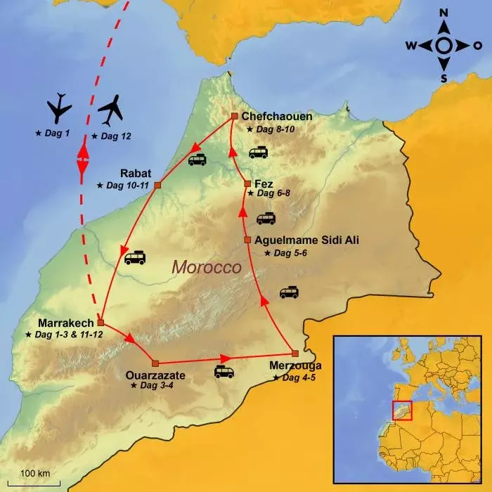 Rejsen begynder i livlige Marrakech, hvorefter du krydser Atlasbjergene via det imponerende bjergpas Tizi n’Tichka og oplever karavanebyen Aït-Ben-Haddou og filmkulisserne i Ouarzazate.