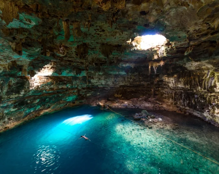 Næste stop er Dzitnup, hvor der igen er mulighed for at bade i krystalklart vand i de fascinerende cenoter: X’Kekén og Samulá. Disse underjordiske vandhuller er kendt for deres dramatiske drypstensformationer og det lys, der strømmer ned gennem åbningerne i klippen, hvilket gør stedet endnu mere magisk.