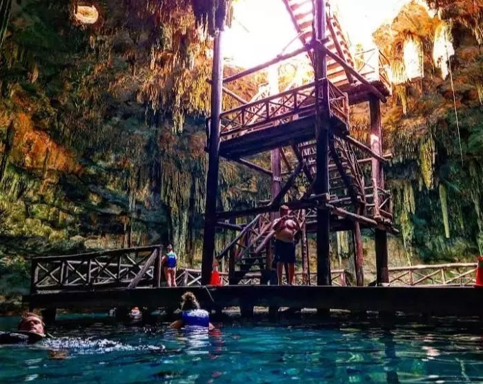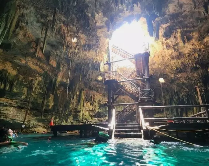 Cenote Chacsikín har et mindre lyshul foroven, hvor solens stråler oplyser det klare, azurblå vand som har en dybde på ca. 16 meter.