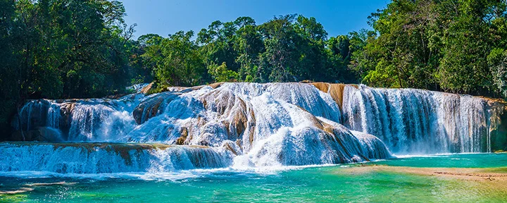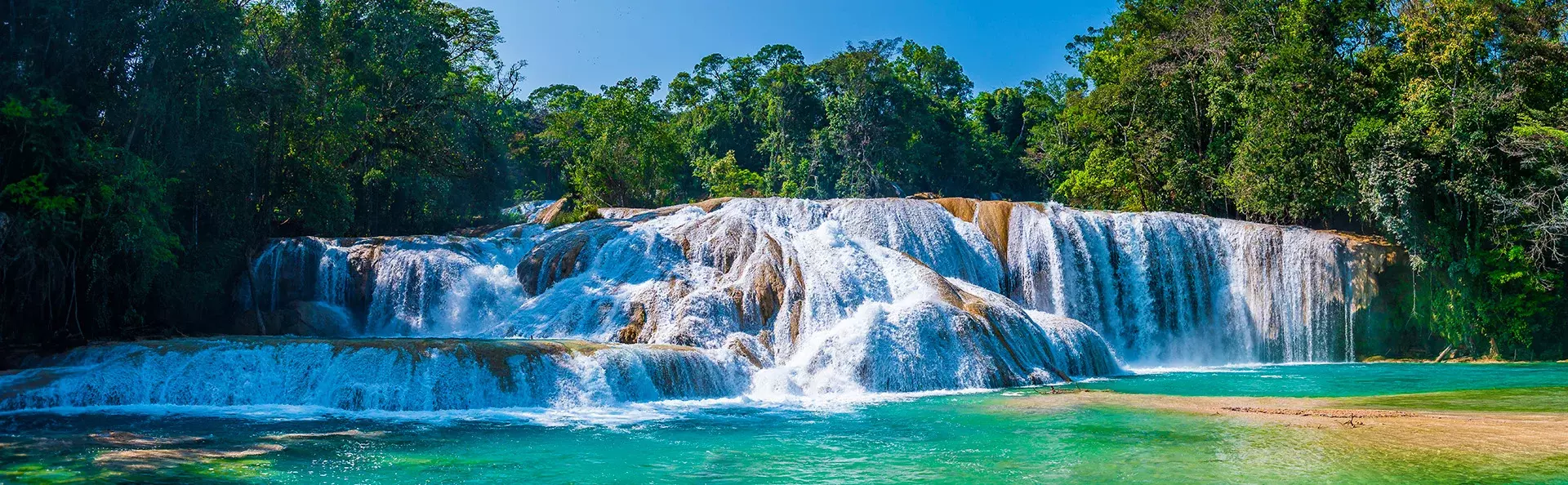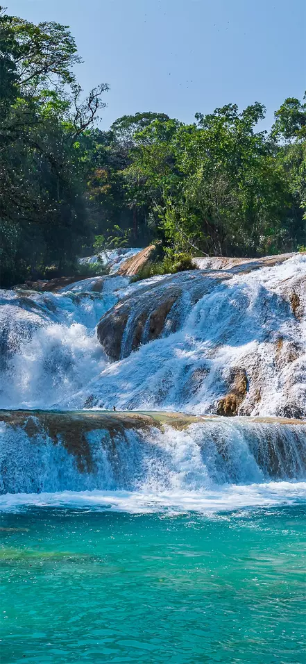 Første stop er ved Agua Azul-vandfaldene (de blå vandfald), som er en serie af brusende vandfald, hvor turkisblåt vand strømmer ned over hvide kalkstensafsatser i flere niveauer. Vandets karakteristiske farve skyldes det høje indhold af mineraler og kalk, der reflekterer sollyset og skaber en næsten eventyrlig kulisse. Vandfaldene ligger midt i frodig regnskov, og langs floden opstår små, naturlige bassiner, hvor du kan tage en forfriskende dukkert. Næste stop er Misol-Ha-vandfaldet, som er et enkeltstående vandfald på ca. 35 meter, der falder dramatisk ned i en smaragdgrøn lagune midt i regnskoven. En lille sti fører om bag vandfaldet, hvor du kan stå i ly af det brusende fald og opleve naturens kræfter helt tæt på.