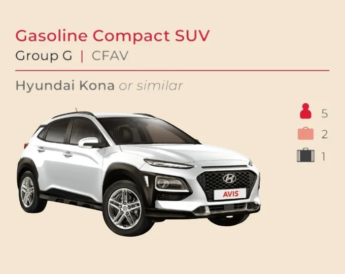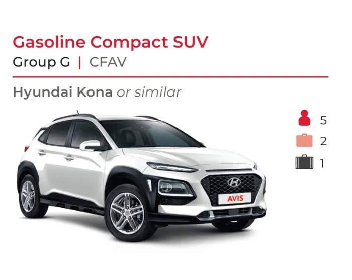 Vi bruger AVIS som biludlejningsfirma i New Zealand. Som standard inkluderer vi en kategori G – ”Compact SUV” Hyundai Kona eller lignende i din inkluderede billeje, som passer til 1-3 personer med bagage. Det er muligt at opgradere til andre kategorier og modeller, hvis I er flere der rejser sammen, eller I blot ønsker en større lejebil.