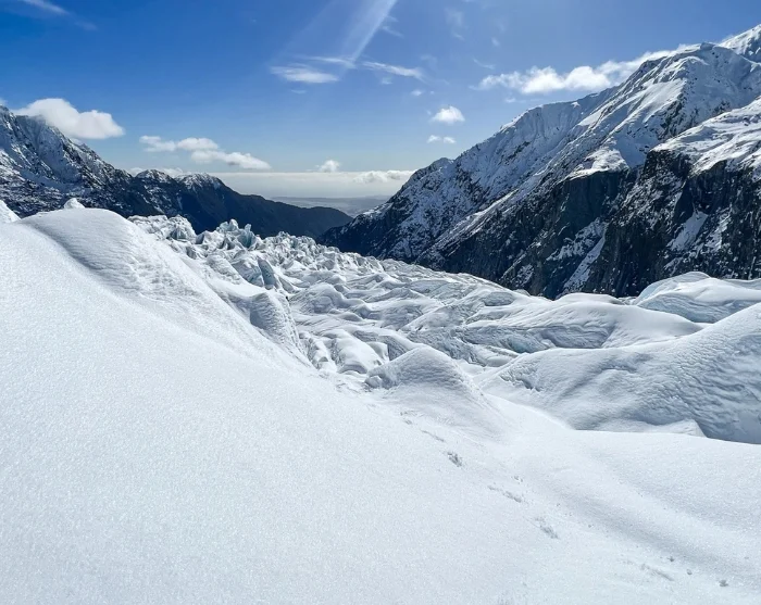 Vil du se den smukke Franz Josef-gletsjer fra oven og stå midt i det frosne islandskab? Så er denne tur lige noget for dig!