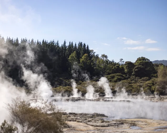 Hell’s Gate er en af Rotoruas mest aktive og dramatiske geotermiske områder, og her kan du bl.a. opleve dampende fumaroler, bassiner med kogende mudder og ikke mindst New Zealands største varme vandfald, Kakahi Falls. Turen afsluttes med en afslappende mudderspa – en traditionel oplevelse på din rundrejse i New Zealand.