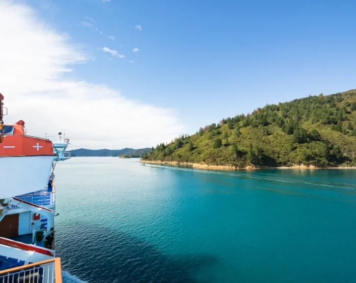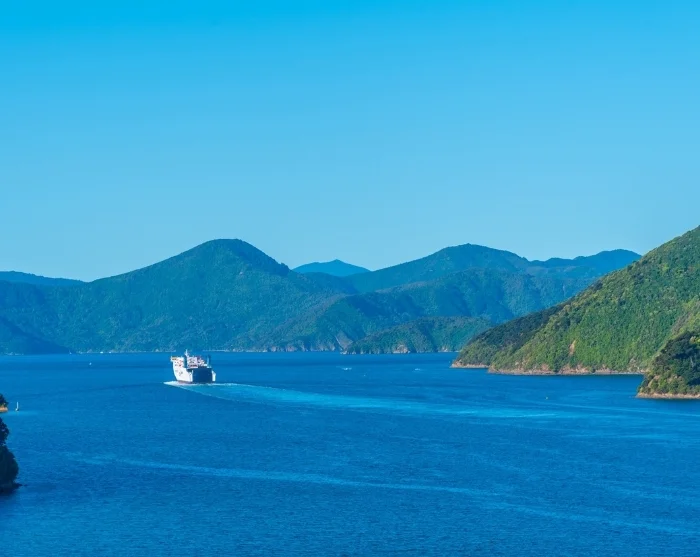 Færgen tager dig over Cook-strædet og videre ind gennem Marlborough Sounds, hvor landskabet skifter fra åbent hav til grønklædte bakker og smalle fjordlignende passager. Indsejlingen til Picton gennem Queen Charlotte Sound, som er en del af Marlborough Sounds, er særligt betagende og et af rejsens store højdepunkter.
