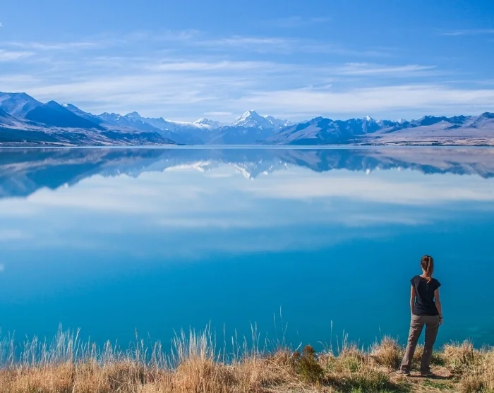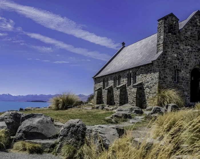 Vi kan anbefale, at du gør stop ved Lake Tekapo (Takapō), hvor det turkisblå vand og den lille stenkirke, Church of the Good Shepherd, skaber et ikonisk motiv.