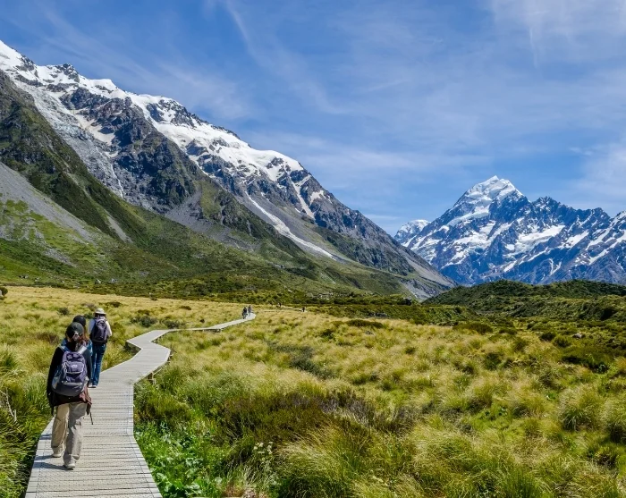 Herefter fortsætter du gennem Mackenzie Country til Aoraki/Mount Cook Nationalpark, hvor New Zealands højeste bjerg, Aoraki/Mt. Cook på 3.724 meter, troner over det dramatiske landskab af søer, dale og sneklædte tinder.