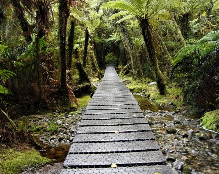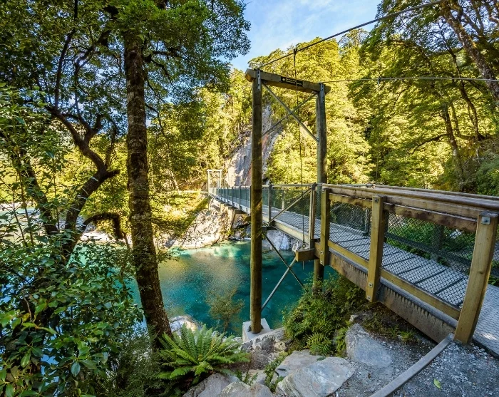 Videre nordpå kører du gennem Mount Aspiring Nationalpark og over Haast Pass, hvor landskabet skifter fra åbne bjergområder til tæt regnskov. Undervejs er der flere gode stop, f.eks. ved de klare Blue Pools eller det imponerende Thunder Creek-vandfald.