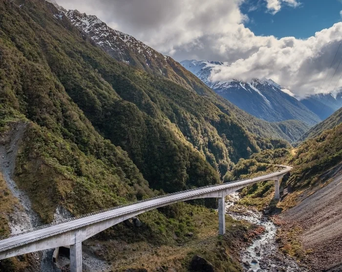 Undervejs kan du stoppe ved Otira Viaduct Lookout og holde øje med den nysgerrige papegøejfugl, keaen. I Arthur’s Pass Village er der mulighed for en pause eller en kort vandretur til det imponerende 131 meter høje vandfald Devils Punchbowl.