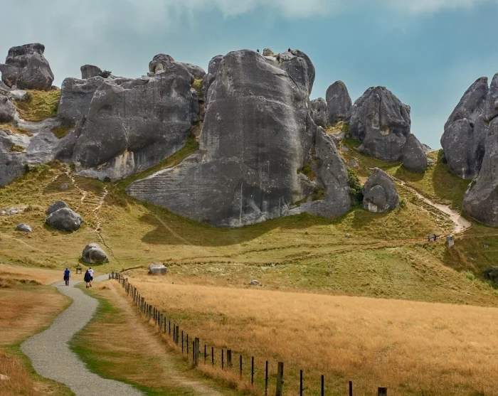 På vej ned fra bjergene åbner landskabet sig igen, og du passerer Castle Hill (Kura Tāwhiti), hvor store kalkstensformationer ligger spredt i det åbne terræn.