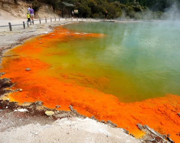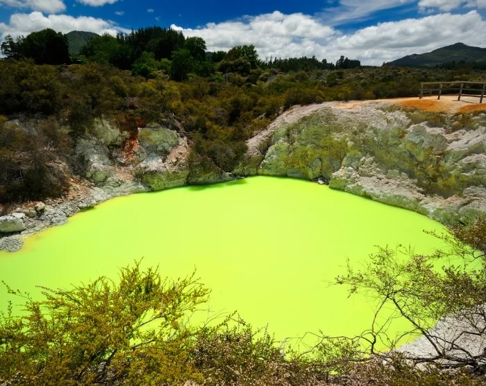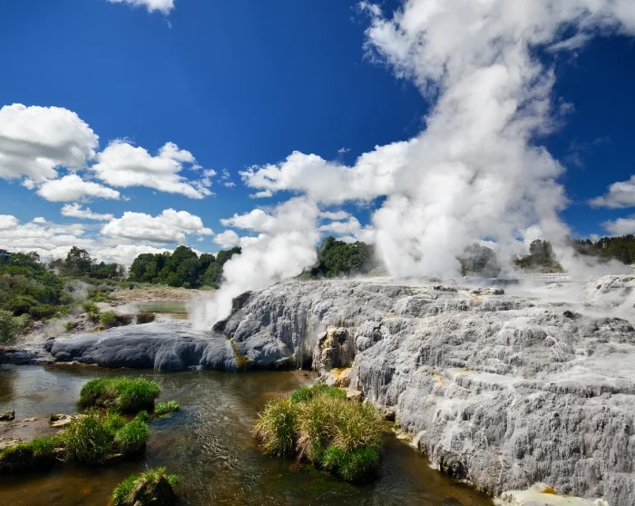 Området er præget af boblende mudderpøle, dampende kratere og varme kilder, og flere steder kan du komme helt tæt på naturens kræfter. Du kan f.eks. besøge Hell’s Gate eller Wai-O-Tapu, hvor farverige søer, damp og gejsere skaber et næsten surrealistisk landskab.