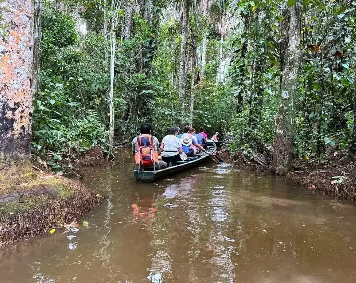 Du bliver hentet på dit hotel og kørt til lufthavnen, hvorfra du flyver til Puerto Maldonado. Det er en utroligt flot flyvetur, hvor der er udsigt til de snedækkede Andesbjerge og den grønne Amazonas-regnskov. Ved ankomst bliver du hentet af en repræsentant fra Corto Maltes Amazonia-lodgen, som vil bringe dig til din lodge via Madre de Dios-floden – en sejltur på ca. 40 min.