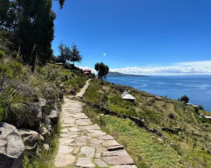 Du nyder en frokost på den smukke kuperede ø, og bagefter tager din guide dig med på en gåtur op til øens højeste punkt, hvorfra der er en betagende udsigt over Titicaca-søen, med høje bjerge i baggrunden.