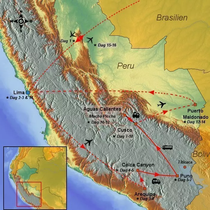 Peru er et utroligt smukt og spændende land. Denne rejse tager dig med på et eventyr du sent vil glemme. Du kan se frem til at opleve byerne Lima og Arequipa, som begge er præget af flotte kolonitidsbygninger. Omgivet af storslåede vulkaner finder du den dybe dal Colca Canyon med hyggelige landsbyer, ældgamle landbrugsterrasser og et spændende dyreliv bestående af lamaer, alpakaer og kondorer. Ved den højtbeliggende Titicaca-sø får du indblik i det oprindelige folks kultur og dagligdag. Du besøger Inkarigets gamle hovedstad Cusco med beundringsværdig stenhuggerkunst, Den Hellige Dal med imponerende terrassesystemer, charmerende landsbyer og farverige markeder samt det berømte Machu Picchu, som er et af Verdens nye vidundere. Rejsen slutter i den frodige Amazonas regnskov med farverige sommerfugle, frøer, papegøjer, aber og et væld af grønne planter.