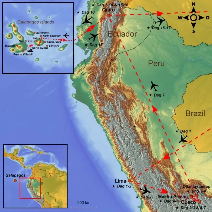 Denne tur kombinerer to fantastiske Sydamerikanske destinationer; Peru og Ecuador. Det bliver en uforglemmelig rejse, der starter i inkaernes gamle hovedstad Cusco, som er et skatkammer af arkitektoniske bygningsværker og ruiner fra både inkatiden og de spanske koloniherrer. Ad snoede bjergveje kører du igennem Andesbjergene til Den Hellige Dal og afslutter med et besøg til den mest berømte inkaruin af dem alle; Machu Picchu.
