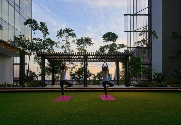 Det er ikke kun udefra, du vil bemærke dets spektakulære måde at omfavne naturen på midt inde i storbyen. På 27. etage finder du nemlig tagterrassen, som er dekoreret med 21 forskellige slags slyngplanter og vinstokke. Her er der rig mulighed for at slappe af på en solseng ved siden af én af de to pools. Nogle etager længere nede finder du endnu en terrasse, som ligner en frodig oase. Tag en god bog med og sæt dig i deres loungeområde eller find træningstøjet frem og lav nogle øvelser på det grønne græsareal, mens du nyder den fantastiske udsigt. Du har også mulighed for at benytte deres fitnessrum, som er åben 24 timer i døgnet.