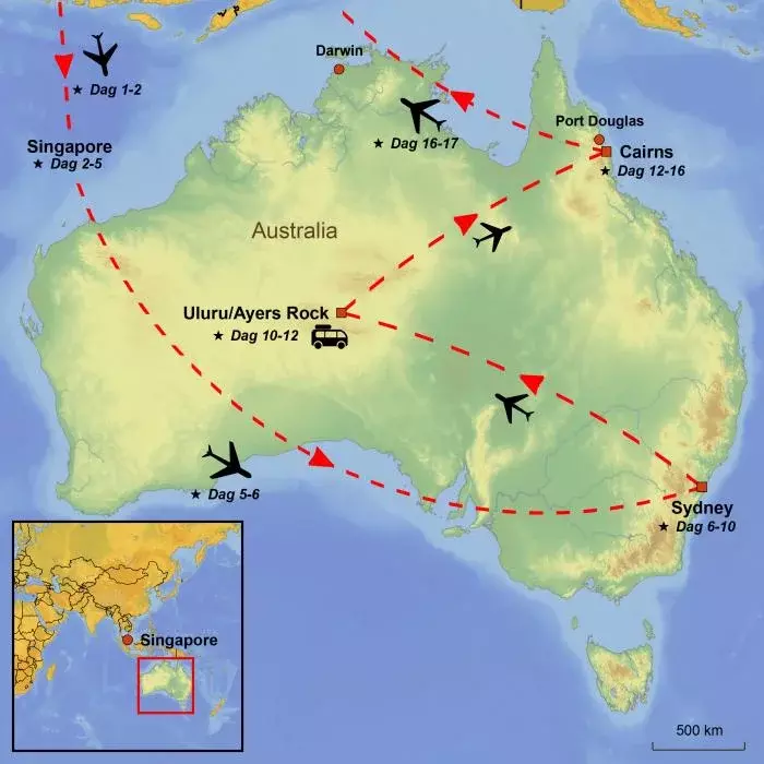 Bemærk: Der er ofte en mellemlanding med flyet mellem Uluru/Ayers Rock og Cairns. Mod tillæg kan der nogle dage flyves direkte til Cairns. Forhør dig om pris hos din rejsekonsulent.
