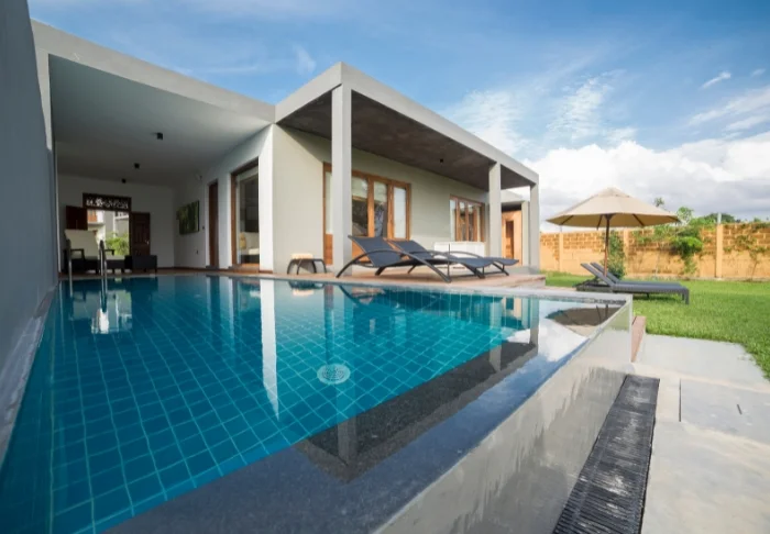 Her i højderne er der køligere end i resten af landet, men måske frister en dukkert i poolen alligevel? Der er tilhørende liggestole, så du kan slappe af med en god bog.
