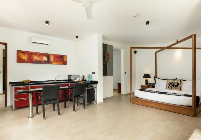 Du bor som udgangspunkt i et Deluxe-værelse, der er indrettet i rolige, lyse farver, som harmonerer med de tropiske omgivelser udenfor. Alle værelser har aircondition, tv, værdiboks, minikøleskab samt badeværelse med bruseniche og toiletartikler. Fra din private terrasse kan du nyde morgenkaffen, mens solopgangens farvepalette viser sig frem på himlen over det azurblå hav.