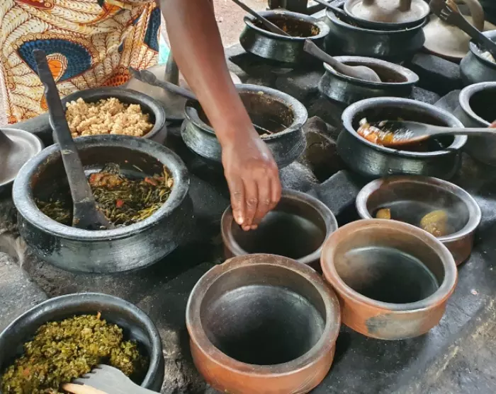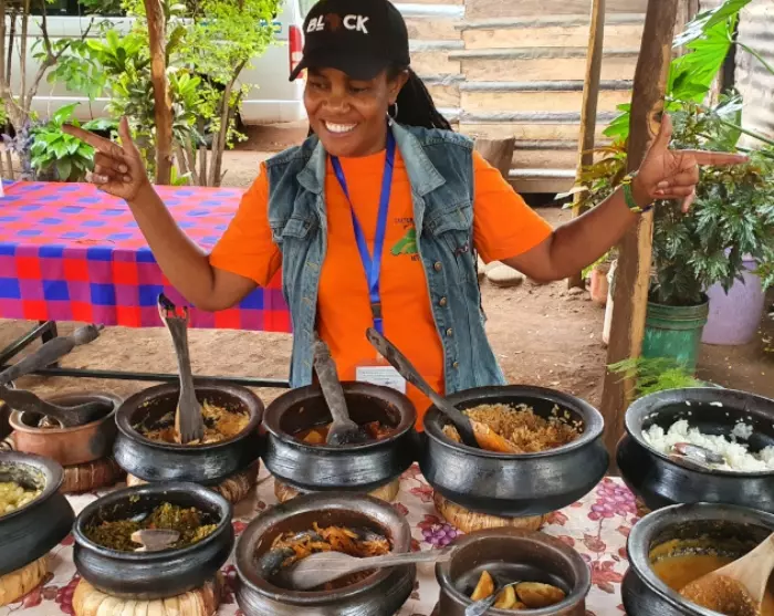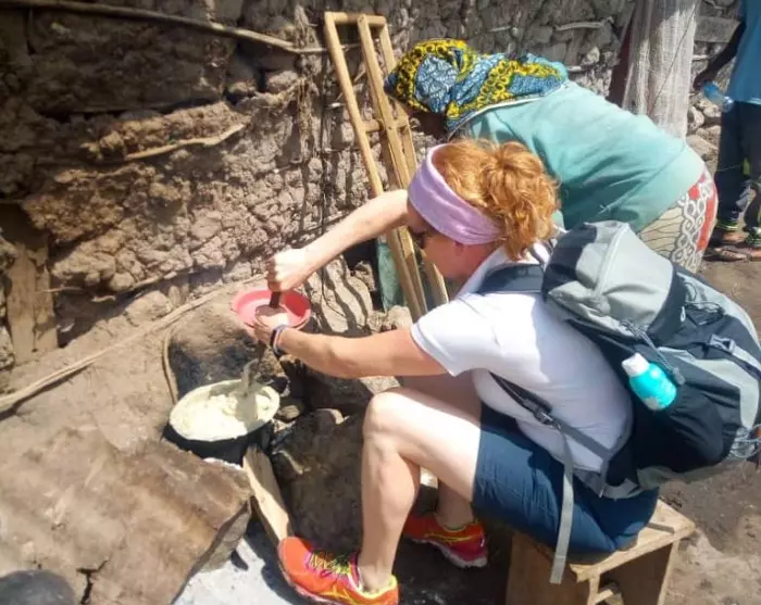 Besøget slutter med en lækker frokost, tilberedt af landsbyens kokke, hvor man kan smage egnsretter fra forskellige områder i Tanzania. Maden tilberedes over åben ild og er utrolig velsmagende. Kvinderne, der laver maden, har alle gennemgået kurser i fødevaresikkerhed, hygiejne og service – en vigtig del af projektets mål om at give lokalbefolkningen, især kvinderne, uddannelse og økonomisk selvstændighed.